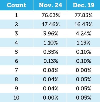 The vast majority of SERPs, before and after the shake-up, displayed one result with authorship mark-up. There aren't really any major differences until you get down to 5/page, and at that point the number of data points is so small that it's difficult to say the difference is meaningful. The mean number of results displaying authorship mark-up on Nov. 24 was 1.326, which fell slightly to 1.305 on Dec. 19.