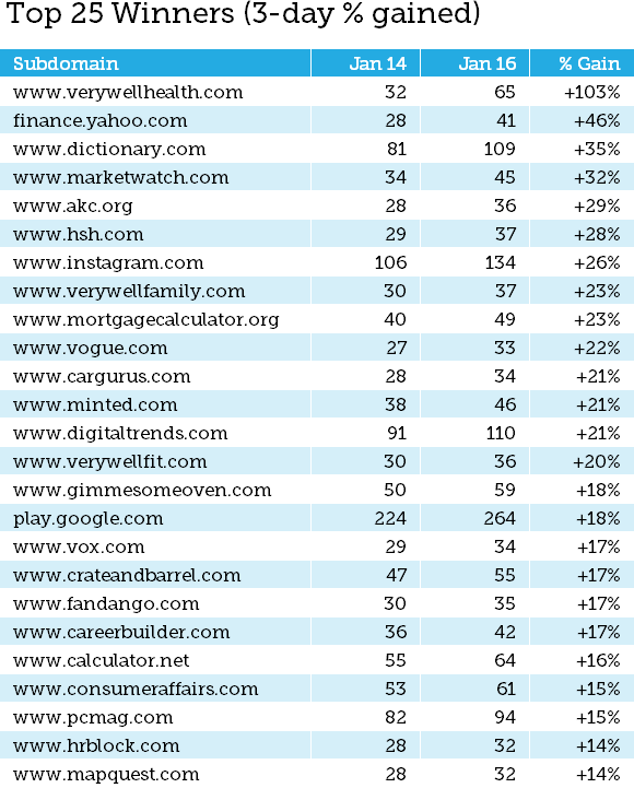 Here are the top 25 winners by % change over the 3 days of the update. The "Jan 14" and "Jan 16" columns represent the total count of rankings (i.e. SERP share) on those days ...