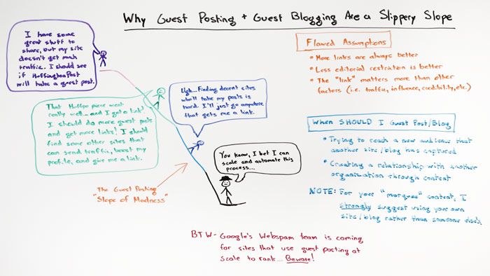 While guest posting can be a wonderful way to build your authority and earn links, it takes a huge amount of effort, and it's easy for marketers to start slipping down the "Guest Posting Slope of Madness." One of Rand's predictions for marketing in 2014 is that Google will begin to crack down on low-quality guest posts, and in today's Whiteboard Friday, he clears up some of the misconceptions that can lead to a downhill slide.