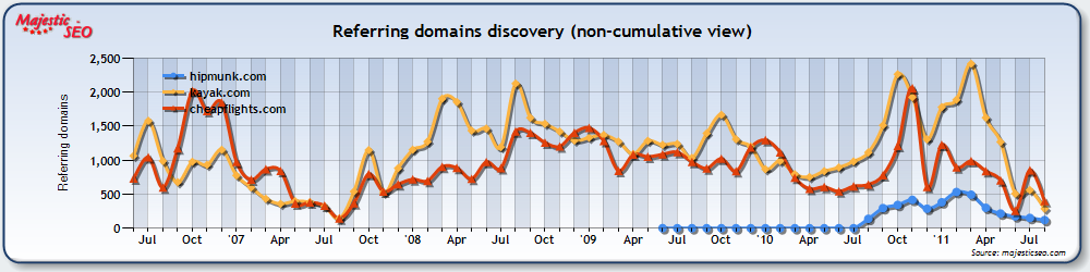 So it seems that Hipmunk don't really need any help link building! Take a look at the following graph (from MajesticSEO) which shows that hipmunk.com is almost gaining as many links per month as the big players like kayak.com and cheapflights.com: