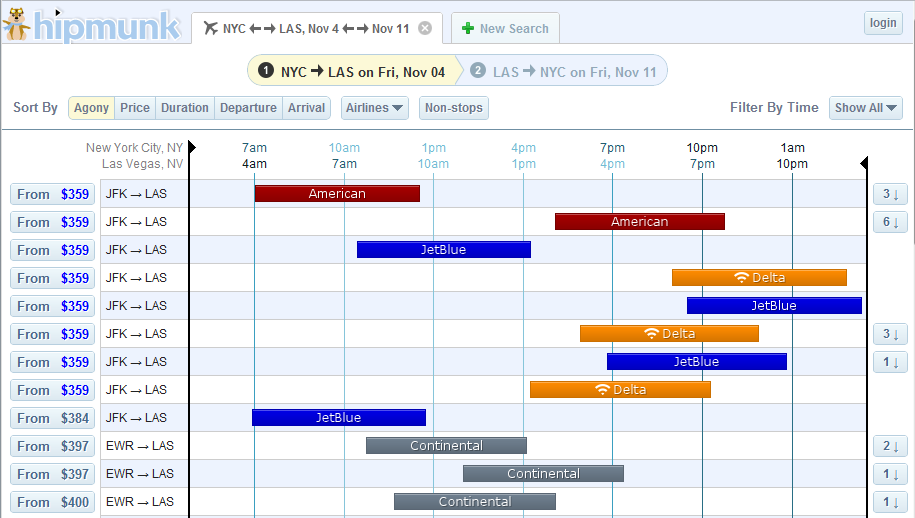 But this principle could just as easily apply to flight search. Looking at the common destinations it would be easy to build out a similar "just buy this one" experience for flights. For example, analysing the most common flight patterns for various destinations would result in the ability for you to predict with confidence the "best" destinations and flight options for those destinations and provide a "book now" button that inspires confidence. The key here is confidence and you'd need to make it clear that if the user is looking for a flight with certain parameters (maybe flights from San Francisco to New York this weekend) then this flight is the least agony (a metric that Hipmunk uses extensively that's a combination of price and hassle).