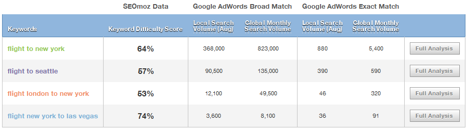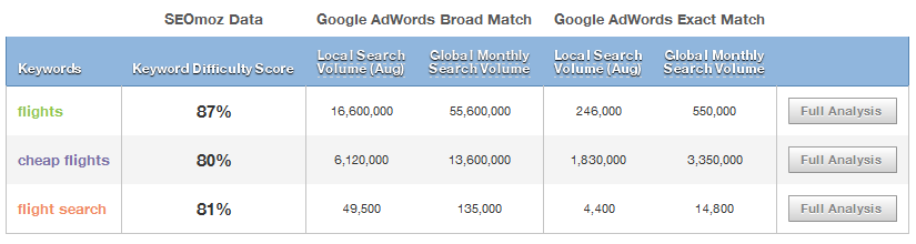 We all know that SEO is links + content + social but how does that relate to the flight search space? Well for starters the space is fiercely competitive. Here are some of the biggest terms they'd like to target: