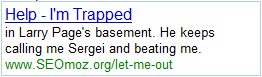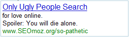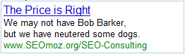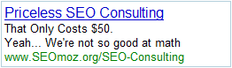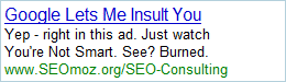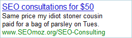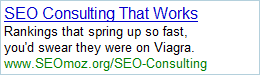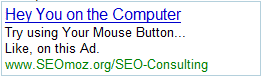Rand asked me for some help with AdWords content. But I really don't know how to grab someone's attention in two lines. That is, without being really crass. So it got a little PG-13 in our apartment this afternoon, what with the liberal use of words like "Viagra" and "Yo Mama" jokes (the latter of which, quite tragically, did not make this post. They were a little too mean).