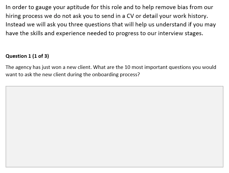 This can stop hiring managers from weighing suitability based on former job titles (of which the SEO industry has no standard), length of time at previous roles, or impressive-sounding brands. Instead, candidates will be invited to interview based on their aptitude.