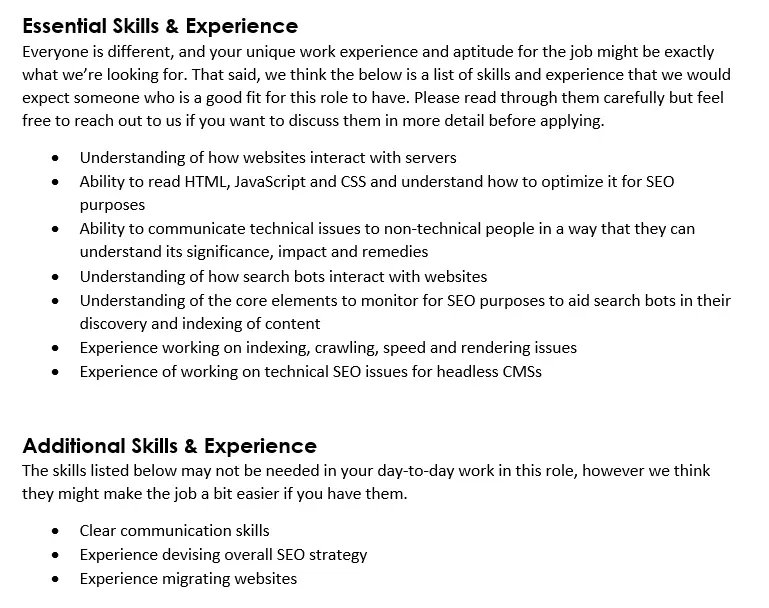 Don’t be overly prescriptive in your job specification, either. Consider whether you really need candidates to have over two years’ of experience with Python. Does this new person have to have the ability to code in HTML, JavaScript, and CSS, or do they just need to know how these languages impact SEO? Do you need someone with copywriting skills, or can they just be great at communicating briefs?