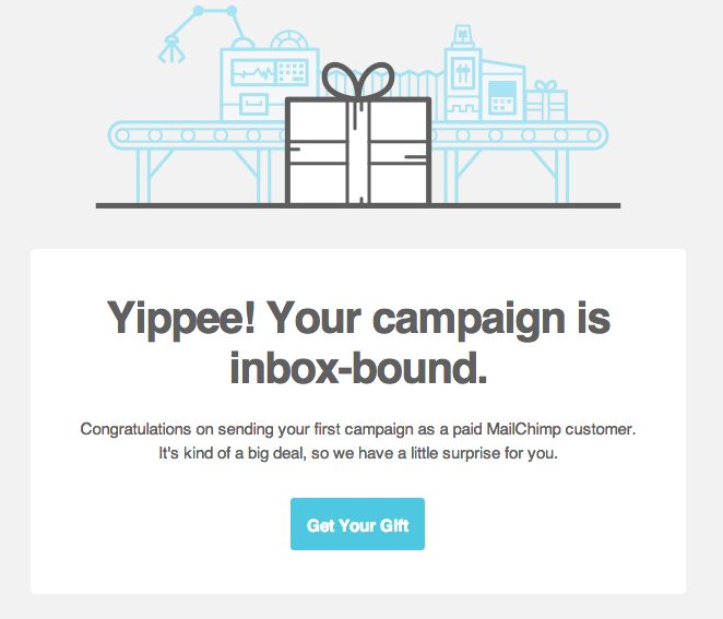 Your first customers will likely become your biggest advocates if — and only if — you treat them the right way. For your first 100 customers, you should be reaching out to each one, personally. I'm not talking about a canned email or an email from your info@ alias. I'm talking about a personal email. This is your chance to build advocates by thanking them for signing up and offering your help, whenever they may need it. It's so simple, yet so many companies overlook it. If you're beyond 100 customers (and have a budget), take a page out of MailChimp's book (Perks Listing) and make the high-touch process a bit more scalable. After sending your first campaign on MailChimp, you'll receive the email below, prompting you to claim your free gift — a MailChimp t-shirt (#want).