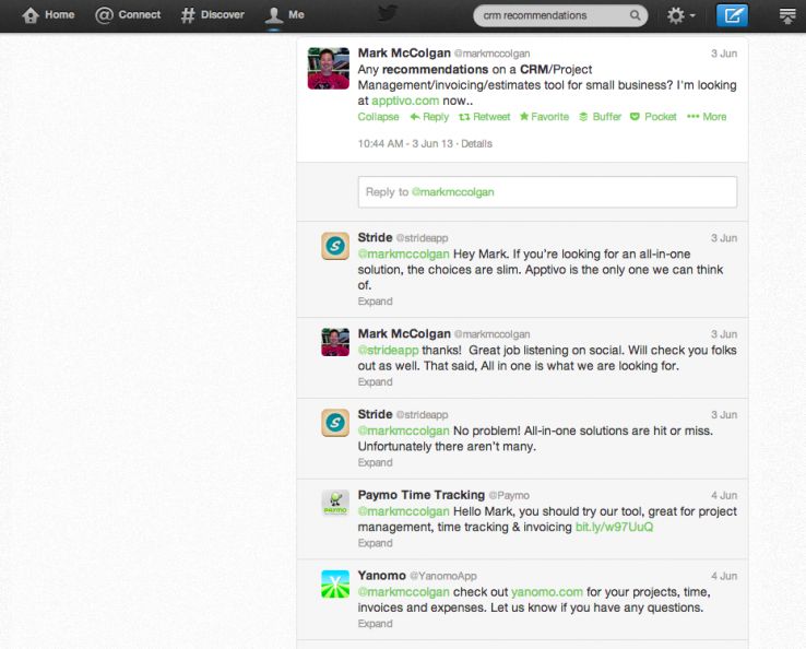 Consider this the guerrilla marketing tactic of the digital age: social prospecting via Twitter. Run a search on your favorite Twitter client for terms related to your product or service and provide helpful responses to those that are looking for help. For example, we do this for Stride, an app I helped create, by searching for the terms like "CRM recommendations" or "client tracking software." Having these searches saved pulls in a constant feed of prospective customers. However, I put this out there with caution; don't be that guy. Don't just tweet out a link. Provide helpful recommendations, often of your competitors, or engage on a topic that may be different from the keywords that led you. There's nothing worse than a feed of promotional garbage.