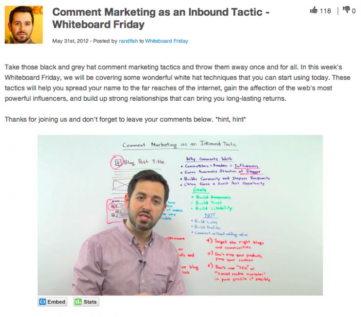 Speaking of Whiteboard Friday, Rand did an awesome one on the next tactic, comment marketing. Using comment marketing intelligently, while providing value, is a great way to build relationships, earn links, and expose your brand to a completely new audience. In attempt to avoid duplicating what Rand said so elegantly, head on over to that Whiteboard Friday post to learn the right way to do comment marketing.