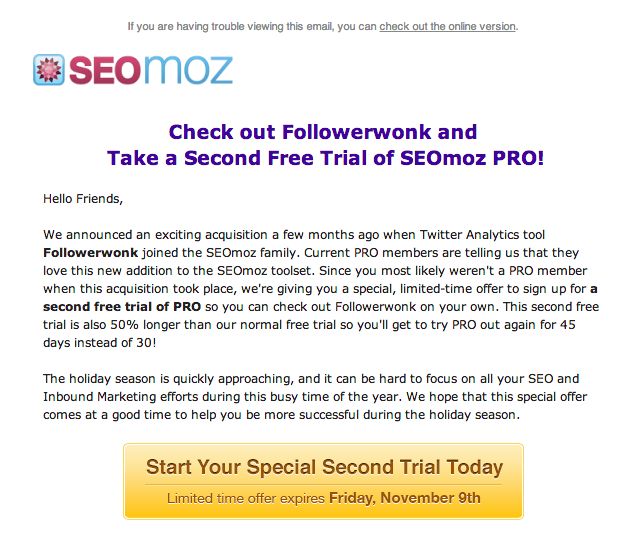 This is one that Justin and Renea on the marketing team have been piloting at Moz, and it's simplistically brilliant. For most SaaS companies, once a user cancels their account or doesn't convert on their free trail, they're forgotten about. Why? Just because the product wasn't a fit at that time doesn't mean that it'll never be a fit. The concept of a winback is to send an email to those in said cohort, with an offer that makes it easy to come back to the product. For Moz, it was an extended free trial period:
