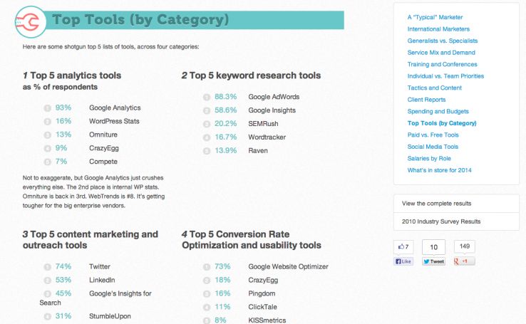 Becoming the voice of an industry can have massive implications on growth. One way to do this, as we've found at Moz, is to create an industry survey and publish the results. By doing this, you not only get to use the results for your own product intelligence, but also become the point of reference for thousands of people in your industry. This, as you can imagine, is a lot of work. Evangelizing the survey to the point it has enough data to make an impact, putting time into the analysis, and finally visualizing the data in a beautiful way can be a huge time investment. That's not to say it's not worth it, only something to consider when prioritizing. Looking back on the impact of industry surveys at Moz, it was definitely worth the time.