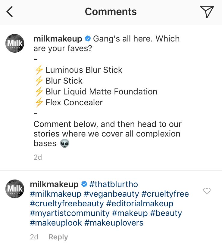 We already know that it’s best practice to engage and respond to followers on social media (within reason), and IG is no different. Onomie, Milk and Glossier all have downright spirited conversations in their photos’ comments sections by prompt fellow ‘grammers to participate in a few ways. They:
