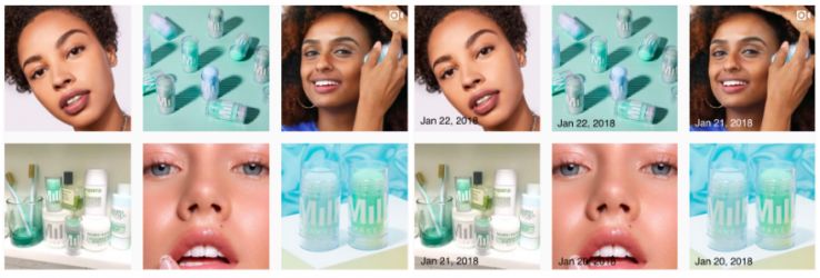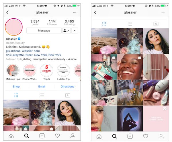 Color schemes remain consistent across Onomie’s, Milk’s, and Glossier’s photos — these beauty brands don’t suddenly change their color palettes from one photo to the next. In fact, they are most likely implementing the same Instagram filters for each photo, or at least editing the color balances so that the photos complement each other. They are deliberately catering to Instagram’s 3x3 grid photo format (or 3x4, or 3x5, depending on your screen size). While many users do see IG posts in their “feeds” when they open the app, users are still motivated to look at IG accounts’ for a number of reasons: IG profiles are the only place where you can add hyperlinks on Instagram, and is also where accounts can pin stories for users to revisit.