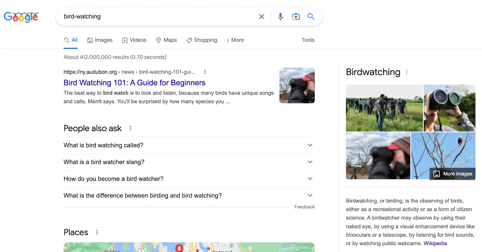 - What does Google think searchers want to see when they search for bird-watching? (i.e. the types of content that are found on page 1 for your target keyword — and surprise! it might not be books).