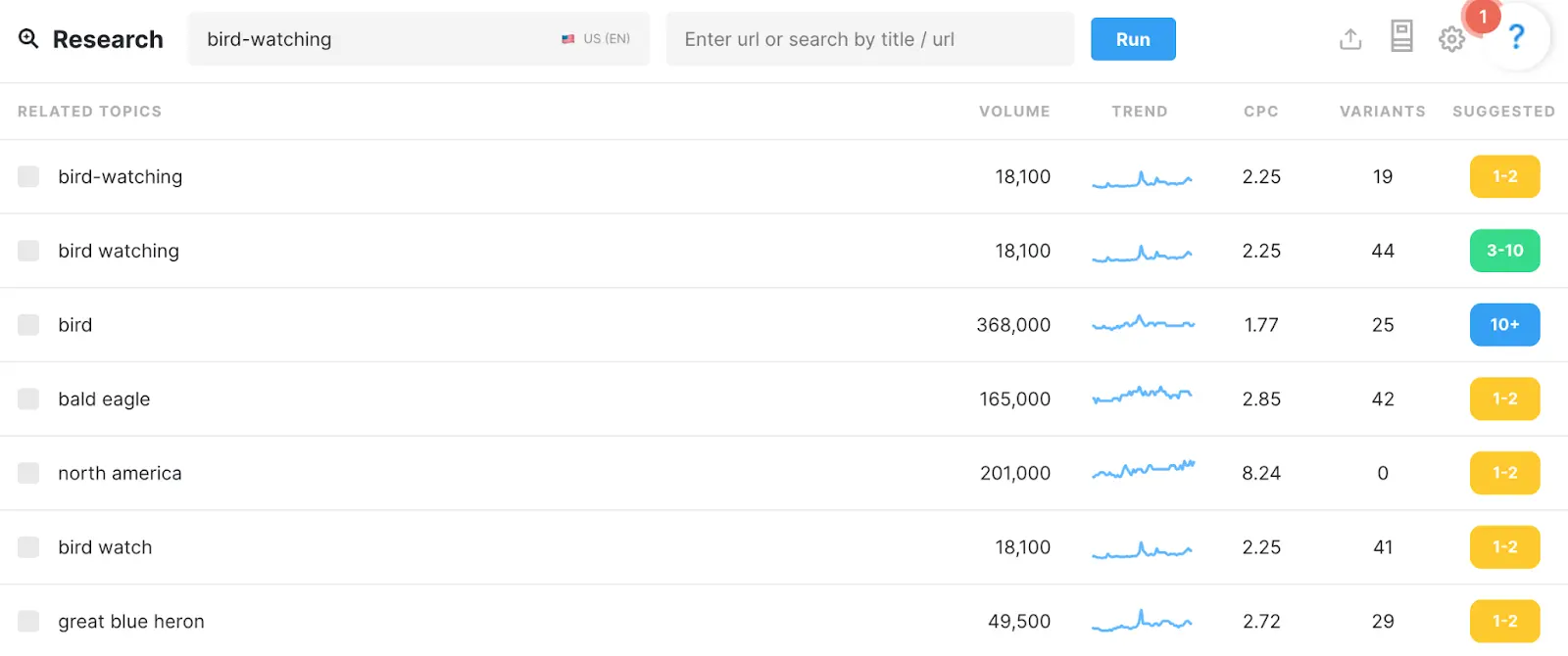 - What do my competitors’ books on bird-watching look like? (i.e. the types of bird-watching subtopics the page 1 results cover).