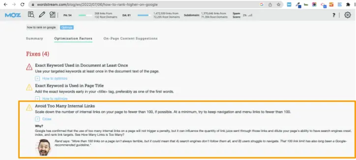 Tip: Keep in mind that this tool will count ALL links found on the page, including those in your main navigation and footer, so the “Too Many Links” warning could be a false positive.