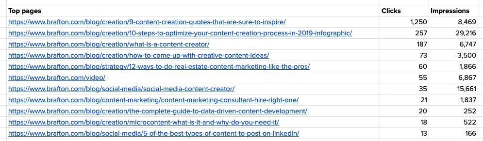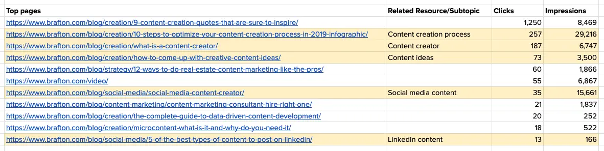 Pull all of the pages currently generating impressions and clicks from terms containing your topic, placing those with the highest clicks and impressions at the top of your list. Here’s what this might look like:
