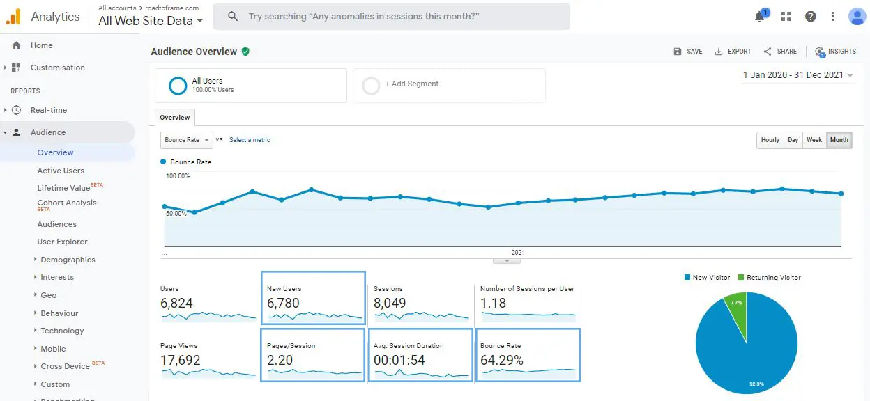 These Google Analytics metrics are incredibly useful for SEO and can be found in Google Analytics > Audience > Overview. Simple!