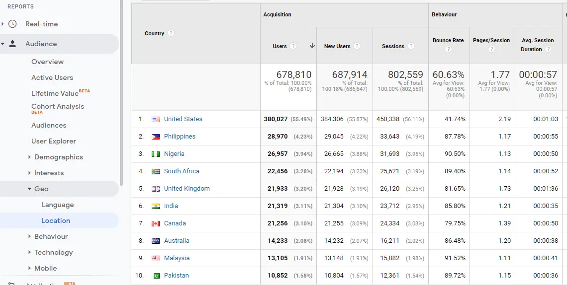 Some investigation proved the traffic was genuine. It was organic traffic from blogs. In this instance, you can accept that websites will occasionally reach audiences in different countries. If the data is not useful, Google Analytics provides an option to filter out traffic by country.