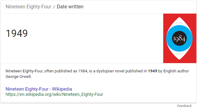 Google has also been testing some hybrid Featured Snippets. In some cases, for example, they attempt to extract a specific answer from the text, such as this answer for "When was 1984 written?" (Hint: the answer is not 1984):