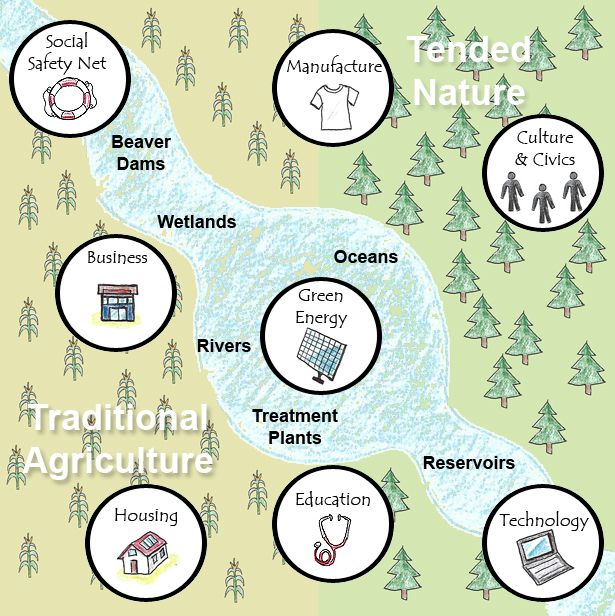 Take out a pen and paper, or open a design program if you prefer, and map out the essential needs of your community. Your community could be your city, or could be a larger geographic area such as a county. Include everything you can think of that human society requires, from water and food, to skills of all kinds, with an emphasis on long-term sustainability. Your map may look very similar to mine, or it could have substantial differences: