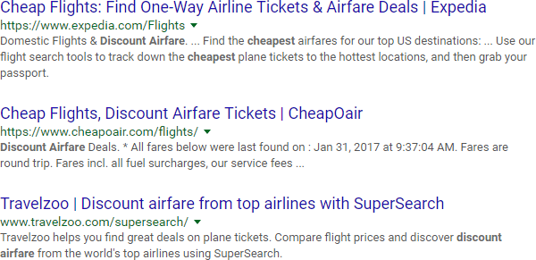 Obviously, the results may still contain synonyms (naturally written content often does), but using exact-match ensures that there will be at least one instance of "discount airfare" in each of the results you get back.