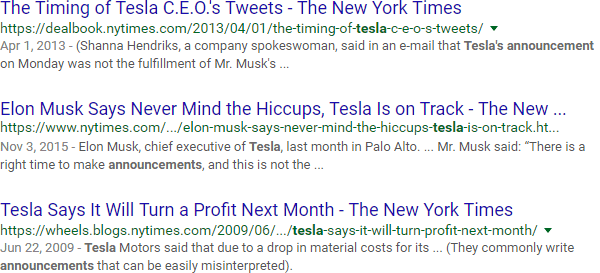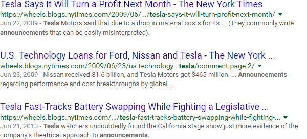 The "link:" operator lets you do competitive link research. For example, the search above looks for all documents relevant to Tesla that have links from The New York Times: