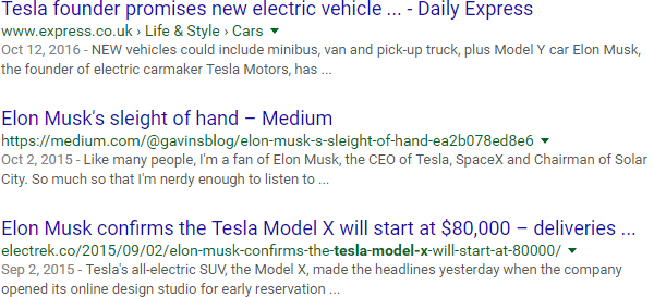 Browsing these results, you can see quickly that Tesla is also a band and a unit of measurement. In addition, Tesla the company makes products other than cars. Keyword exclusions are also called "negative keywords" (thus the minus sign).