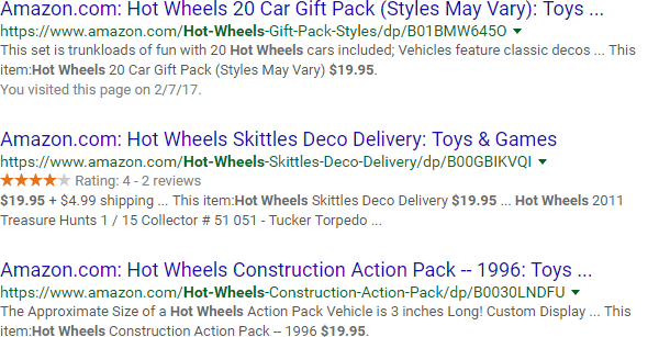 You can also combine a ($) search with the range operator (..) and search a range of prices. Let's say you wanted to find any pages mentioning "Hot Wheels" and prices in the $19-20 range: