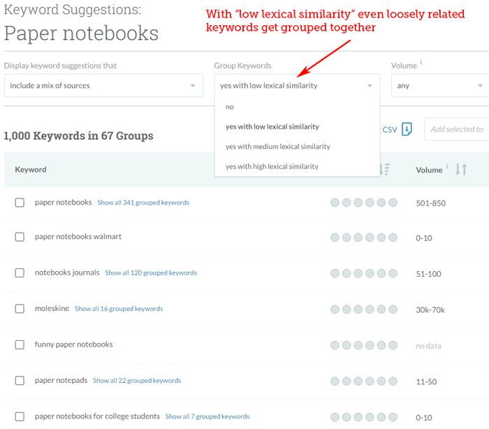 Rather than wading through large volumes of similar keywords and adding each variation to a list, we've added auto-grouping as atop any list of keyword suggestions. This is helpful for discovering and focusing on themes, and adding a whole group of related keywords to your own research lists.