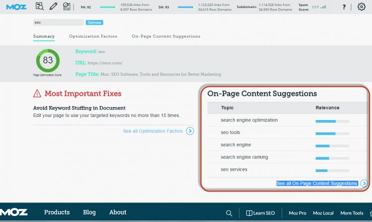 This new tab shown with Page Optimization reports lets you see the topics that your SERP competition is writing about. This can help you understand what kinds of keywords signal topical relevance to Google and provide good ideas for how you can make your content more robust and relevant to searchers. I’m not going to go too deep here, but check out Jon White’s fantastic post for some great tips and examples to get the most from this feature. Rand also shares some great tips in this Whiteboard Friday, Using Related Topics and Semantically Connected Keywords in Your SEO.
