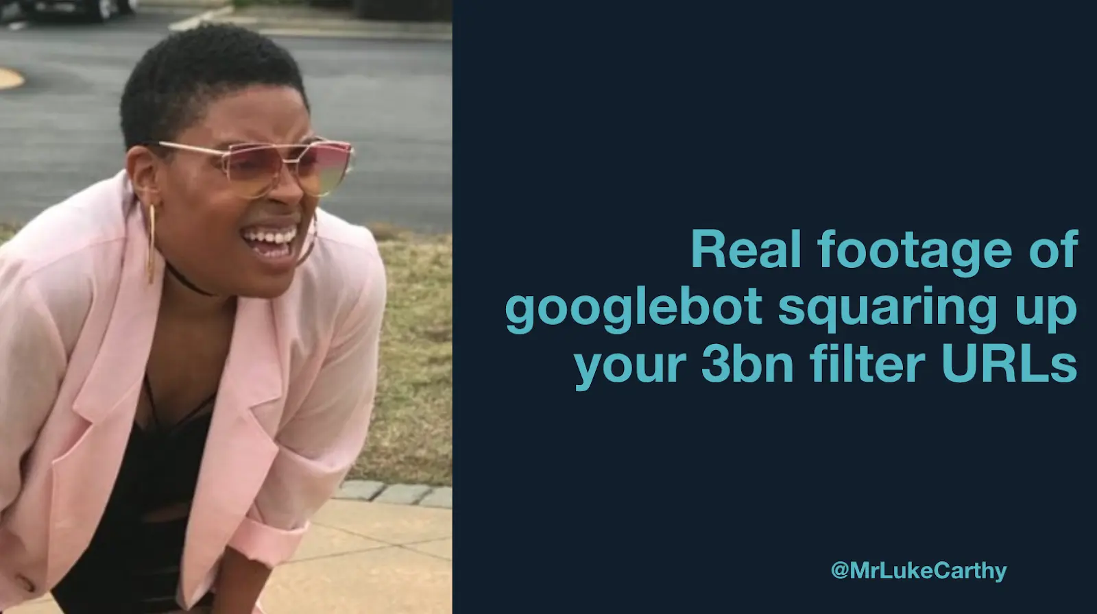 After an introduction that got the whole chat laughing (“Hi, I’m Morgan Freeman. Welcome to the afterlife.”), Luke Carthy showed us how he generated a 25% increase in organic traffic using faceted navigation.