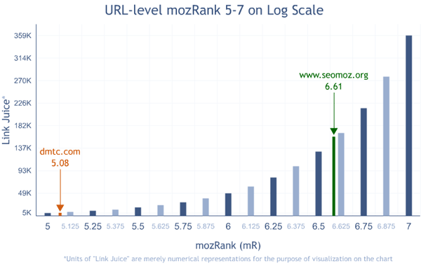 Suddenly you can see the real difference in SEO effort between a mozRank 5.08 and a mozRank of 6.61, and the work left until mozRank 7. Show this the next time someone gives you a hard time about that link building effort you're making. Or better yet, the next time you're link building, be sure to measure where you are today, and choose the right link building tactics. What worked to get you to mozRank or PageRank 5 just isn't going to cut it if you're going after that elusive 7.