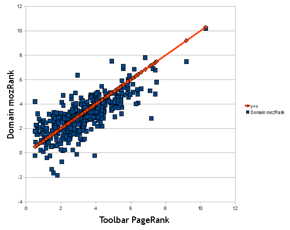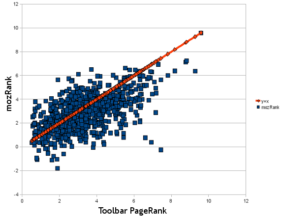 This graph visually shows how mozRank compares to PageRank. The x-axis represents toolbar PageRank* of a page, and the y-axis represents mozRank for the same page. I've included the line y=x, which shows what perfect correlation would look like. For you stats junkies the Pearson's correlation coefficient is 0.48, which is good, but not perfect correlation.