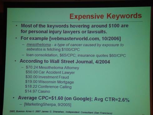 Dr. James Shanahan: His session was about combating click fraud. He explained 2 kinds of click fraud, the advertiser side and the publisher side, and why the Cost Per Action (CPA) approach may be the best solution to combat click fraud. He also mentioned that “most of the keywords hovering around $100 are for personal injury lawyers or lawsuits” (one example he gave: mesothelioma). It was one of the best presentations in terms of the quality and amount of information shown on slides. He provided interesting approaches, statistics, and examples.