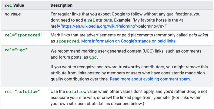 - rel="sponsored" - For paid or sponsored links. This would assumingly include affiliate links, although Google hasn't explicitly said.