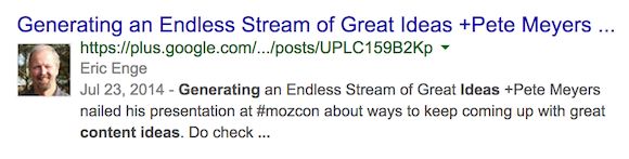 I find it interesting that Google has retained Authorship-style snippets in personalized (logged-in to a Google+ account) searches for Google+ posts by people you have circled.