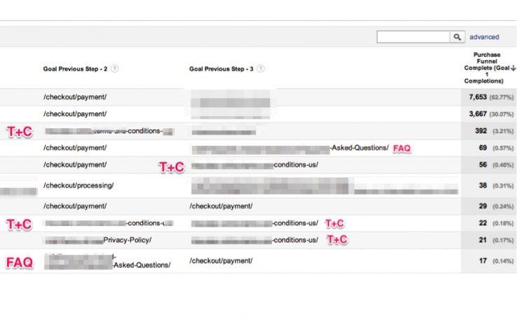 I've had to blank a lot out for privacy reasons, but the point can still be seen: Out of the top 10 routes to the thank-you page,
