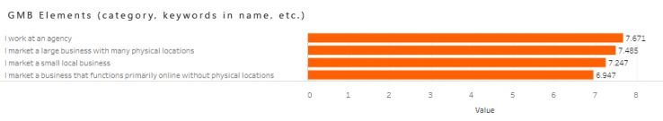 Overall, Google review elements rank second, and within this statistic, it’s survey takers who market one small local business who rate the influence of reviews most highly, on average. These would presumably be independent business owners or their in-house marketing staff who are regularly eyeing the local packs to see what seems to move the needle.