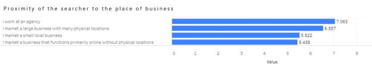 Overall, the proximity of the searcher to the place of business ranks third, and within this group, it’s agency workers who, on average, rate the influence of proximity most highly. So, again, it’s this group of marketing professionals who are contributing to the depiction of proximity being of less influence than GMB factors.