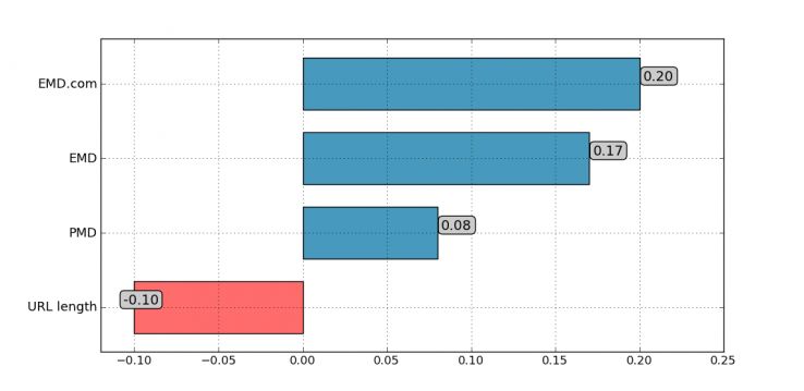 However, we see a see-saw pattern in the EMD correlations (red line) where they decreased last fall, then rose back again in the last few months. We attribute the decrease last fall to Google's EMD update (as announced by Matt Cutts). The increase in correlations between March and June says that the EMDs that are still present are ranking higher overall in the SERPs, even though they are less prevalent. Could this be Google removing lower quality EMDs?