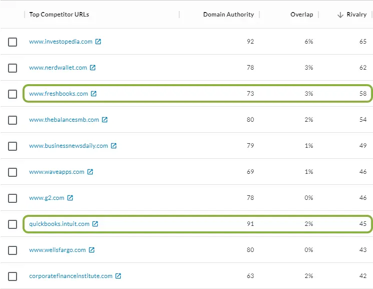 FreshBooks and QuickBooks immediately stand out as familiar brands in the accounting software space, and FreshBooks is in a very similar DA range. These are very likely product competitors and give us a talking point during the call. In addition, note these competitors: