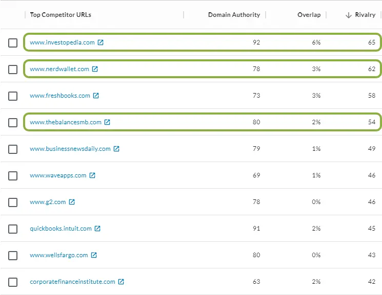 These are content competitors that have significant overlap with Xero and are competing for organic traffic. Our prospect may not think of NerdWallet (just to pick one) as a competitor, but their content could provide key insights into questions potential buyers are asking.