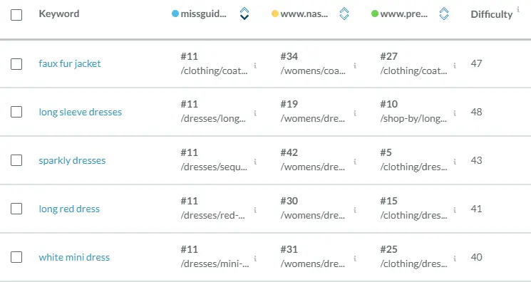I’ll skip right to the insights (note that MissguidedUS.com has a DA of 64). I can see right away that Missguided is up against some big players in the retail space, including high-end department stores and Amazon. These competitors are aspirational and might not be a realistic focus, but this is a great topic for conversation. Who do they aspire to compete against and how do they face the reality of being in a market with these big players?