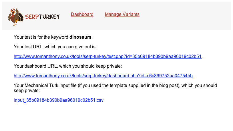 This page has your dashboard URL on it. It is very important you don't lose this as it is the only way you can return to see your results or edit your variants! Don't lose it! Bookmark it!