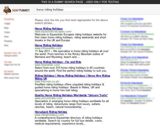 I ran a search for 'sharks' and imported the results into SERP Turkey. I then ran a search for 'great white sharks' and I imported the top two results and placed them in positions four and six of the 'sharks' results. I setup the SERP Turkey results page to show that the search term was 'great white sharks', however, the results showed were the 'sharks' results with my two more relevant results inserted.