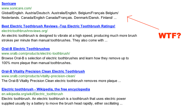 Sonicare have position 1, beating out Wikipedia and their competition. Great job guys, we say... then we look at the snippet. They don't even have a meta description on the page!?