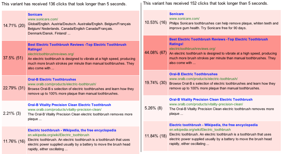 The results on the left show the raw clicks (first click per user only - if they went back and clicked a second result it is ignored), and the results on the right showed the results when those faster than five seconds are filtered out. I knew some users wouldn't look properly and I found five seconds a good threshold for filtering out people who just clicked without really looking (you can view any time threshold you want).