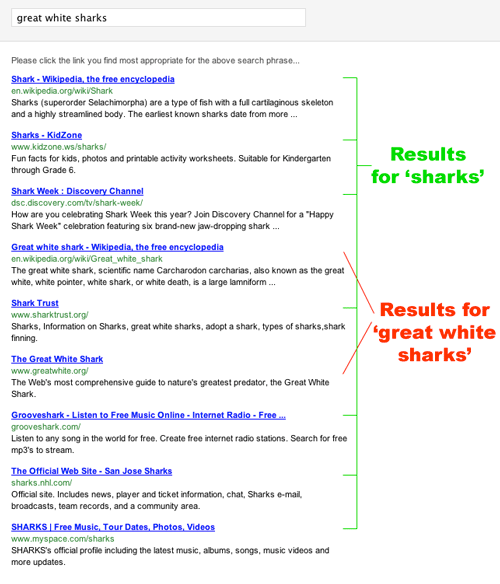 You can see in both cases that over 65% of the clicks were focused on the two 'most relevant' results. In both cases the Wikipedia page for 'sharks' in position number 1 also attracted a lot of clicks, but it is also a relevant result and I imagine that it mimics real search results in some sense (it is in position 1, it is wikipedia, it isn't irrelevant).
