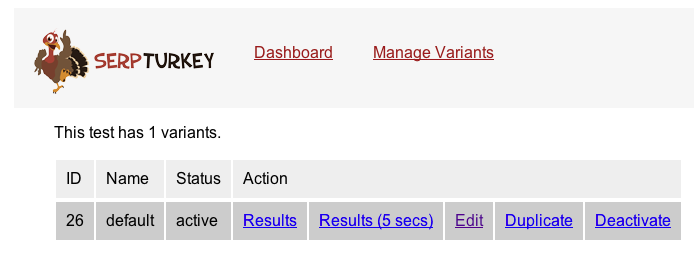 This page is where you can manage the various variants/samples SERP results. It is pretty self-explanatory - you can view the current result, including the five second filtered versions (you can change the URL parameter to any filter time you want), you can edit, duplicate and deactivate variants.