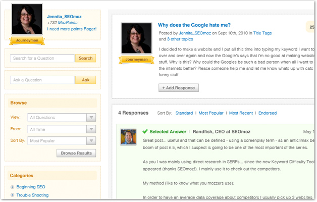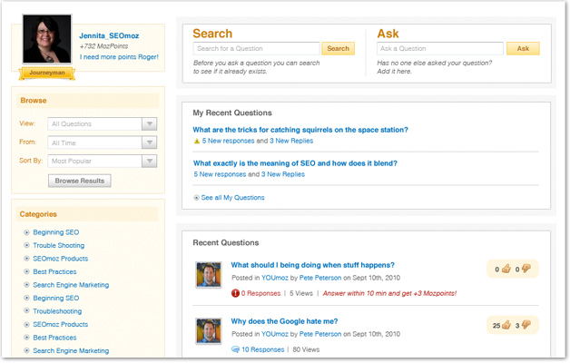 Pretty slick eh?! You'll get your questions answered quicker and gain mozPoints at the same time. Plus you'll still be able to ask one private question per month which will be answered by the SEOmoz stafff or an Associate. hoorah!